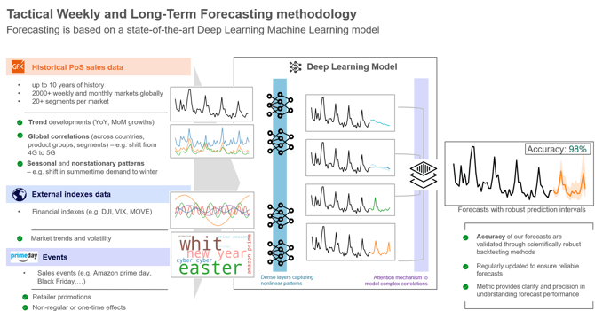 The forecasting output is produced using deep learning that learns from up to 10 years of historical MI / POS data. The data are consumed by brands, product groups, segments on a global level. This type of model can capture highly complex correlations, a significant improvement on traditional statistical methods. This is enhanced with market expert input for special events.