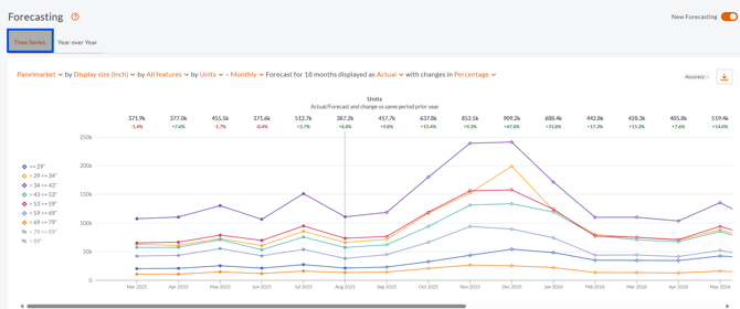 The Forecast insights show sales units and revenue at market and segment level (total and values side by side e.g. different inch sizes, split by channels (e.g. internet and physical store sales, where available). The Forecasts are updated weekly and/or monthly as new data becomes available, automatically capturing the latest economic trends and adjustments.