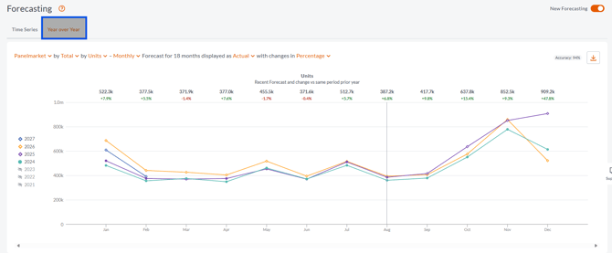 - A black vertical line which represents the latest current available data (left side including current month or week) and the forecasted data starts on the right hand of this line.